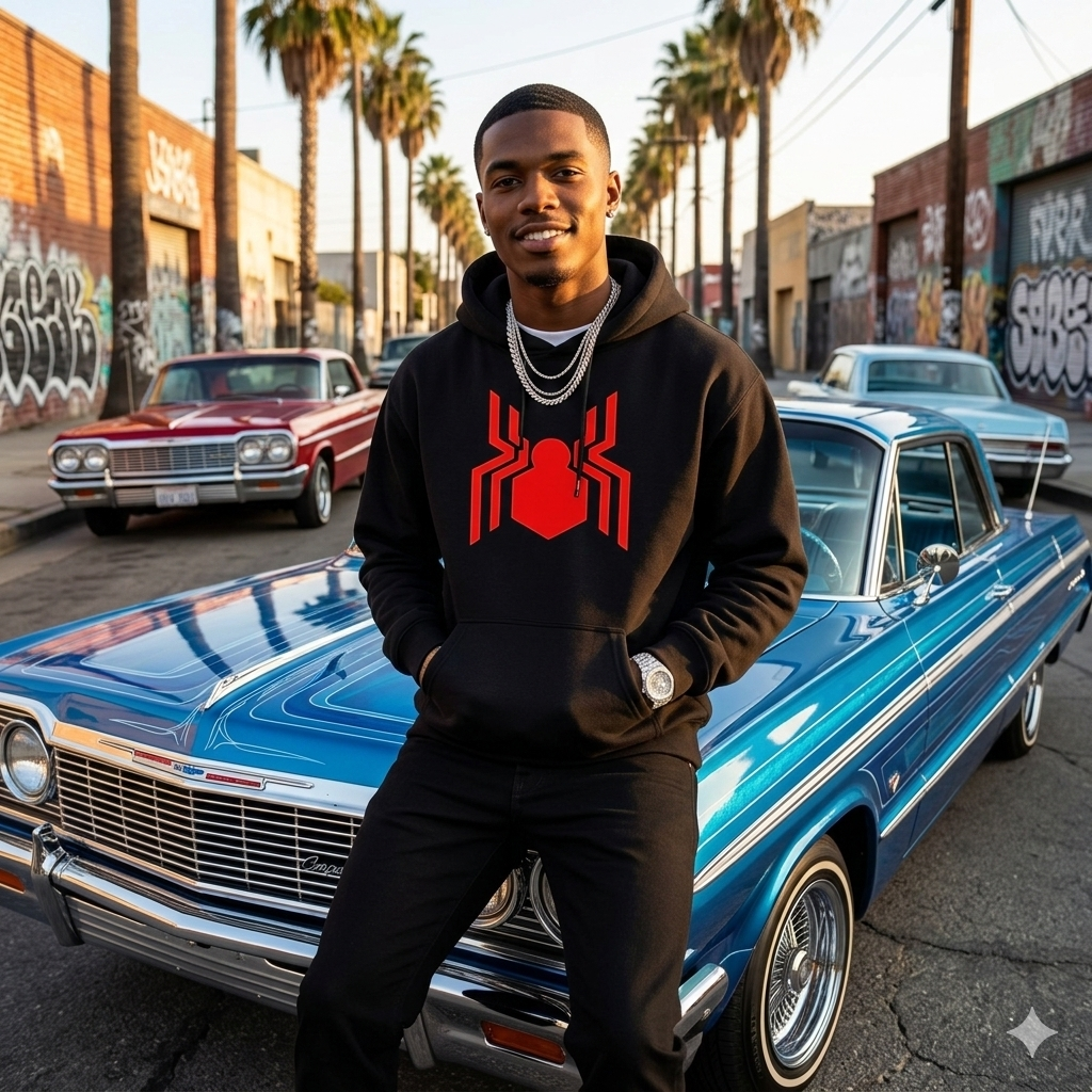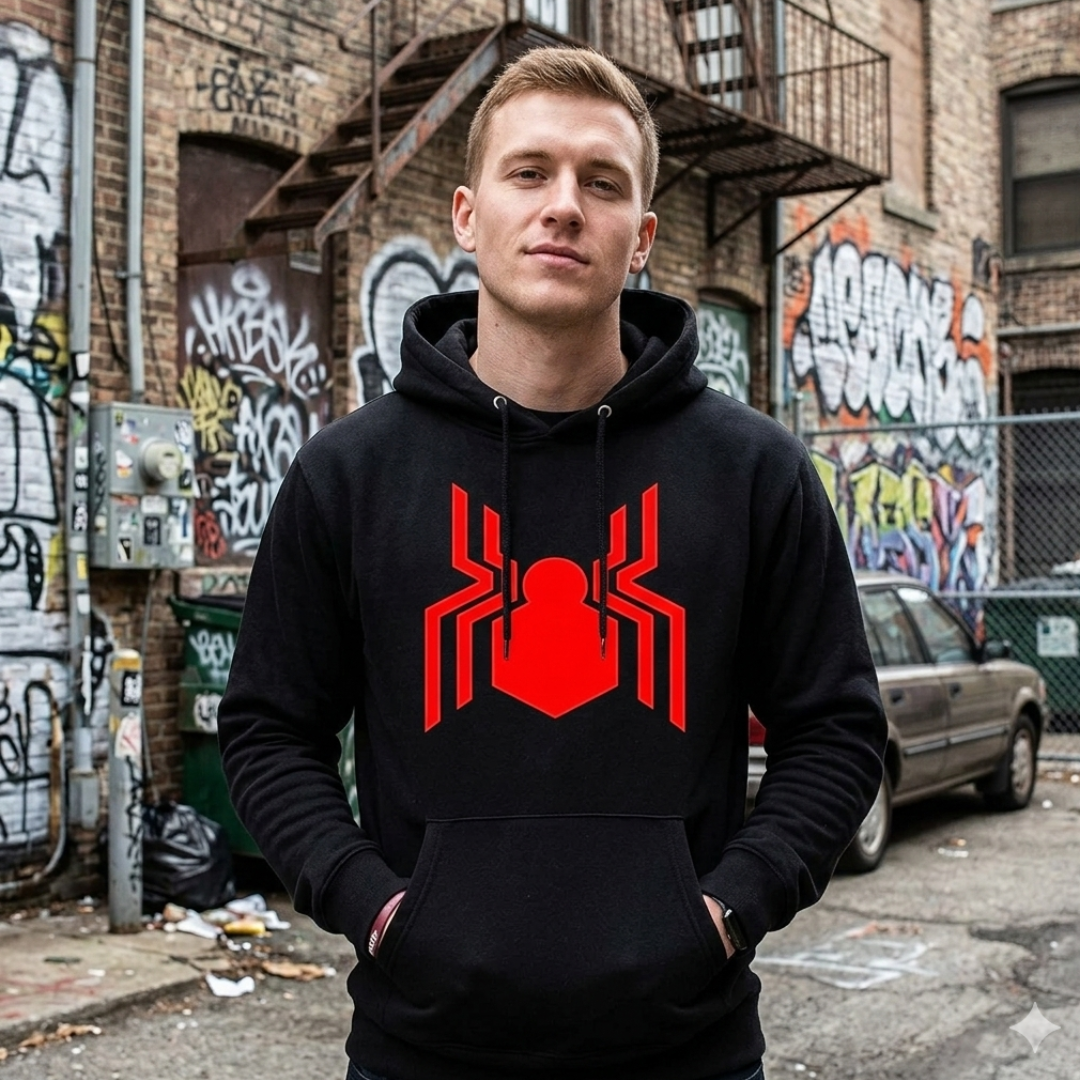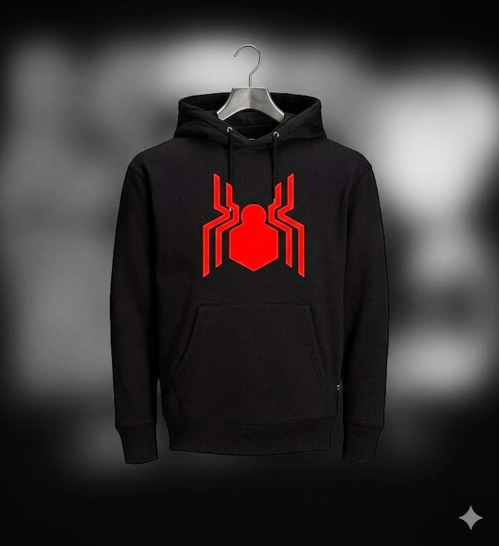 The centerpiece of this hoodie is the vibrant red geometric spider emblem, precision-printed for a sharp, clean finish. This isn’t just a standard graphic; the stylized, angular lines offer a futuristic, minimalist take on a classic symbol, making it perfect for streetwear enthusiasts and fans alike. Set against a deep, jet-black backdrop, the contrast is engineered to pop in any lighting.
