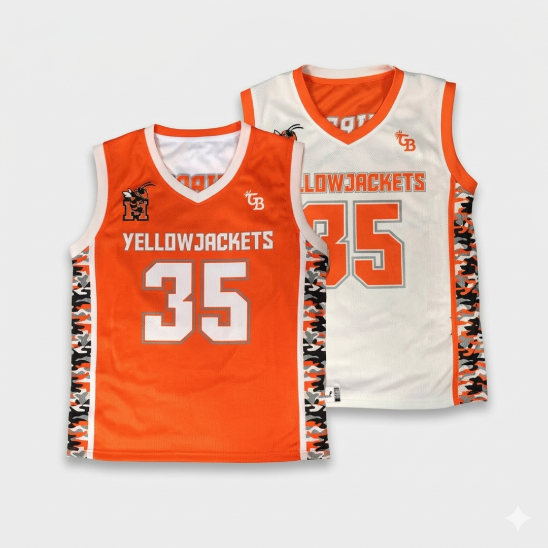 These are custom sublimated sports jerseys designed for basketball or multi-sport performance. The design features the “YellowJackets” team branding with a bold, modern aesthetic.